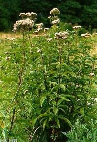 PIANTA ERBACEA PERENNE, ALTA DA 0.5 A 1.5 METRI, CON FUSTI ERETTI E PELOSI. LE FOGLIE SONO CARATTERISTICHE PER ESSERE PERFOLIATE, OVVERO LA BASE DI DUE FOGLIE OPPOSTE SI UNISCE ATTORNO AL FUSTO, DANDO L'IMPRESSIONE CHE IL FUSTO PERFORI LA FOGLIA. LE FOGLIE SONO LANCEOLATE, RUGOSE E DENTATE. I FIORI SONO PICCOLI, BIANCHI, TUBULOSI E RIUNITI IN NUMEROSI CAPOLINI CHE FORMANO DENSE INFIORESCENZE CORIMBOSE ALL'APICE DEL FUSTO. OGNI CAPOLINO È COMPOSTO DA 10-15 FIORI ERMAFRODITI. IL FRUTTO È UN ACHENIO PICCOLO E NERO CON UN PAPPO BIANCO DI SETOLE.