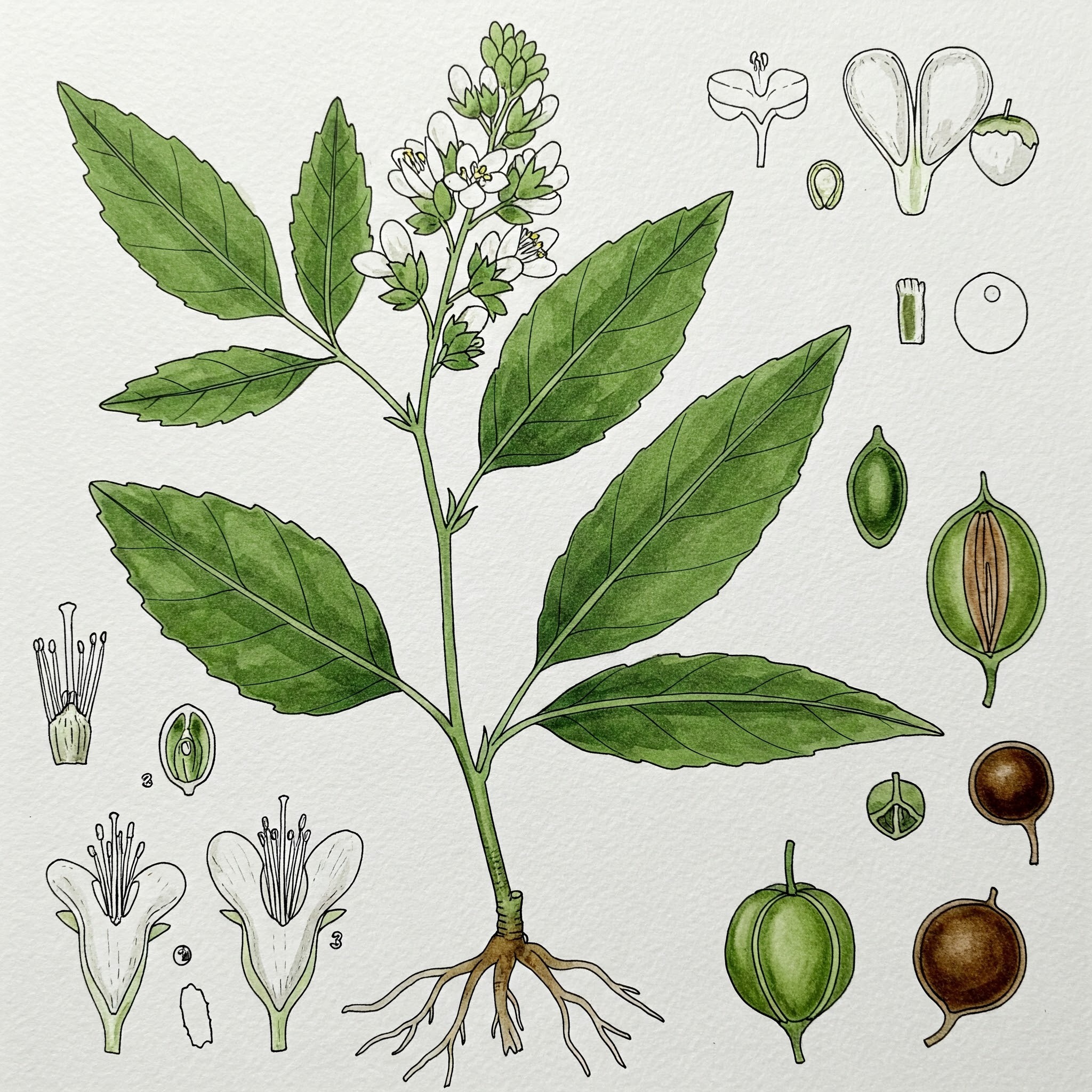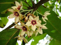 ALBERO SEMPREVERDE ALTO 15-20 M CON CORTECCIA SPESSA E SCURA. FOGLIE OVALI, CORIACEE, LUCIDE, LUNGHE 3-5 CM. FIORI BIANCHI A FORMA DI STELLA DI 15 MM IN CORIMBI DENSI. FRUTTO SECCO CON CINQUE FOLLICOLI CONTENENTI 10-20 SEMI.