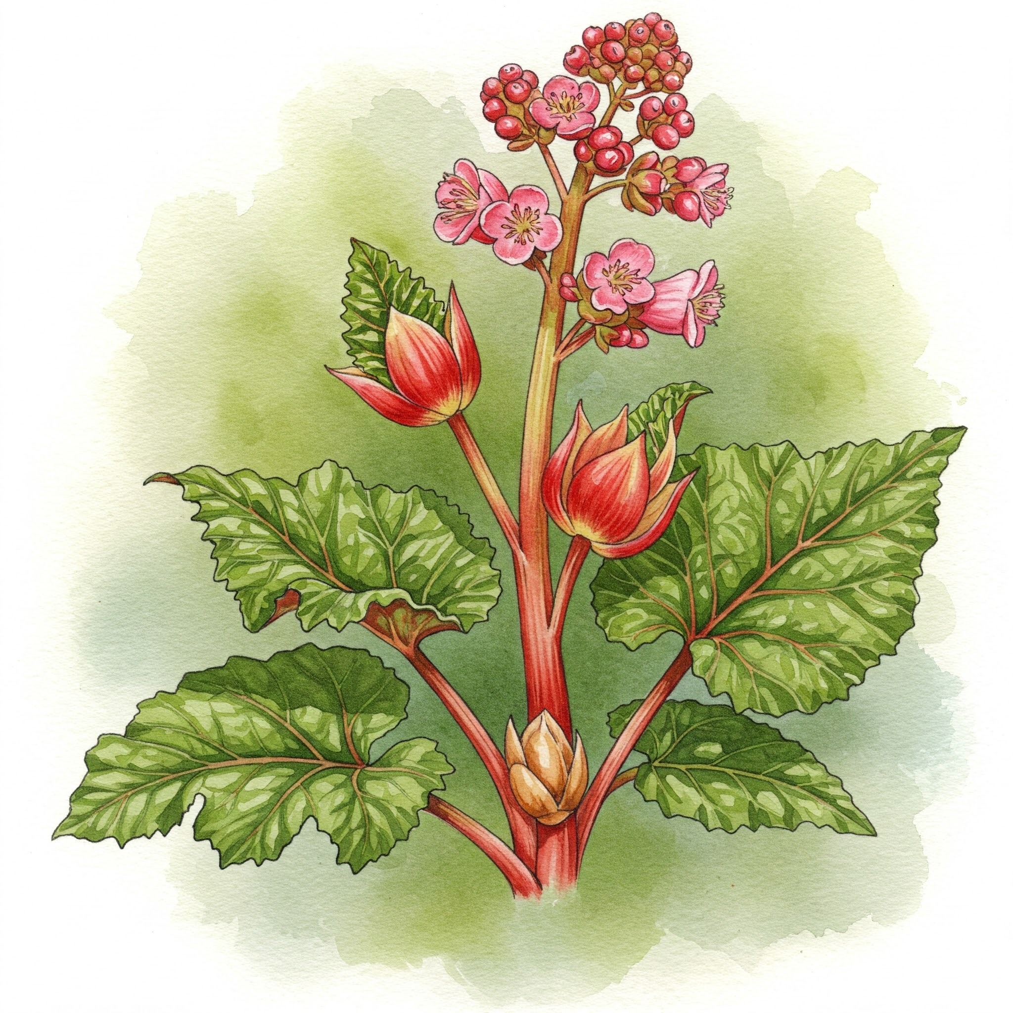 ERBACEA PERENNE CON ROBUSTO RIZOMA LEGNOSO. FOGLIE BASALI GRANDI, ROTONDE O RENIFORMI, CON LUNGHI PICCIOLI CARNOSI. FUSTI FIORALI ERETTI, ALTI FINO A 2 METRI. FIORI PICCOLI, VERDASTRI O BIANCO-ROSATI, IN GRANDI INFIORESCENZE COMPOSTE. TEPALI 6. STAMI 9. OVARIO SUPERO, TRIANGOLARE, CON 3 STILI. FRUTTO ACHENIO TRIGONO.