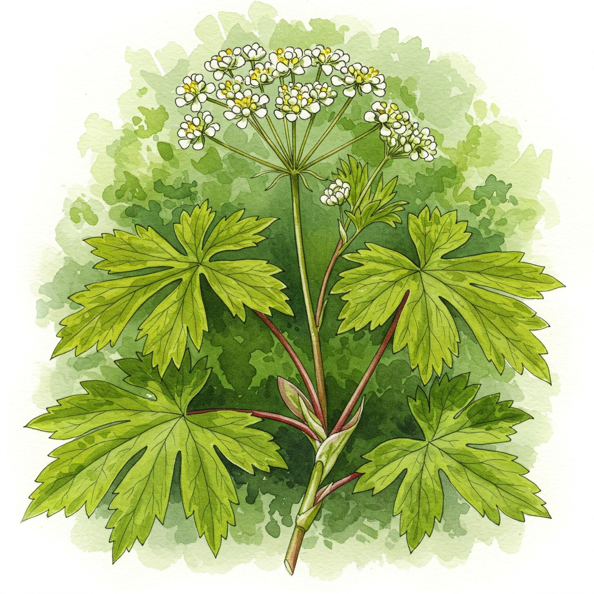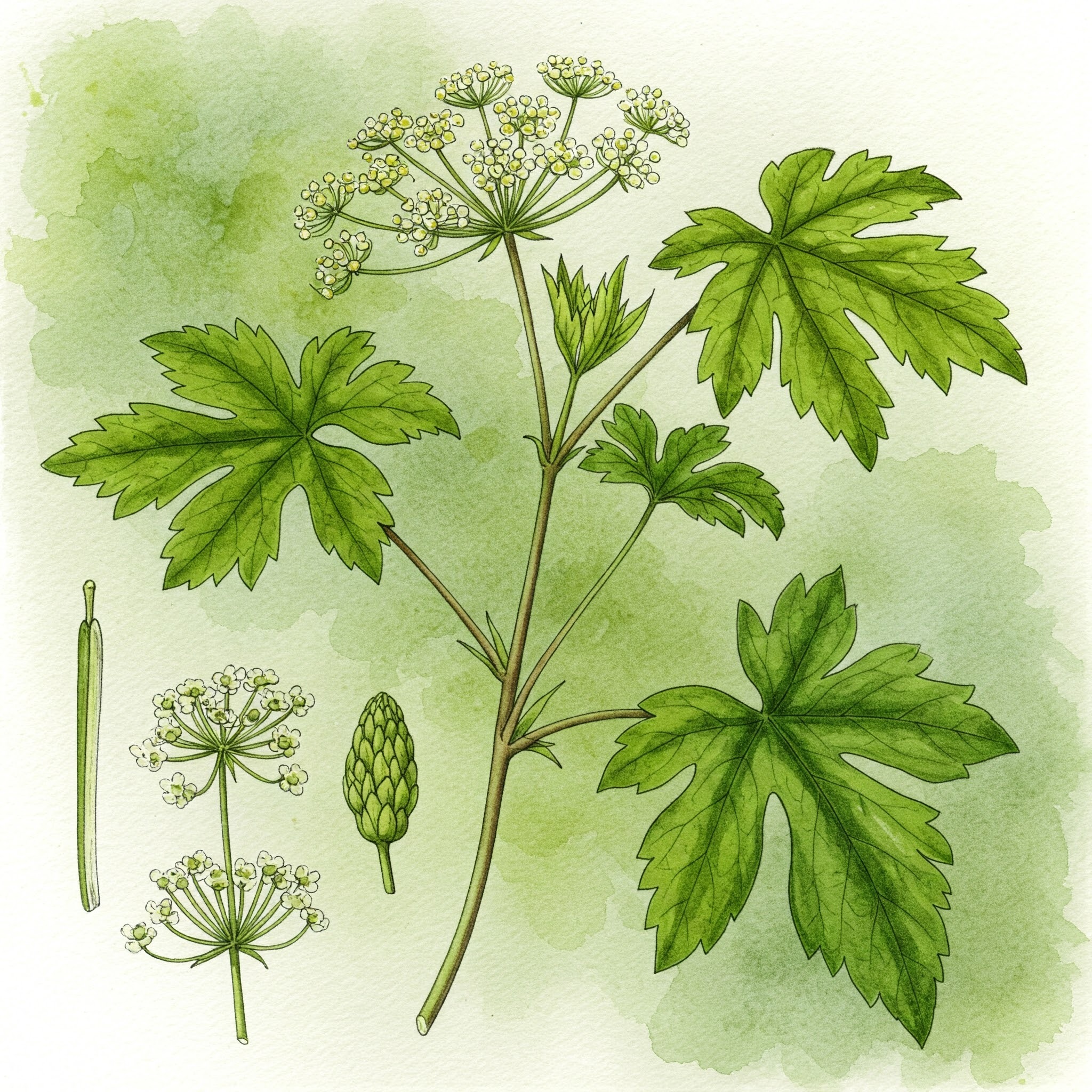 ERBACEA ANNUALE ALTA FINO A 1 METRO, GLABRA. FUSTO ERETTO, ROBUSTO, RAMIFICATO IN ALTO. FOGLIE BASALI LUNGAMENTE PICCIOLATE, PENNATOSETTE CON LACINIE OVATO-LANCEOLATE E DENTATE; FOGLIE CAULINE PROGRESSIVAMENTE RIDOTTE E PIÙ DIVISE. INFIORESCENZA A OMBRELLA COMPOSTA GRANDE E DENSA, CON NUMEROSI FIORI PICCOLI, BIANCHI. FRUTTO È UN ACHENIO OVALE, APPIATTITO, CON COSTE SOTTILI E ALATE.