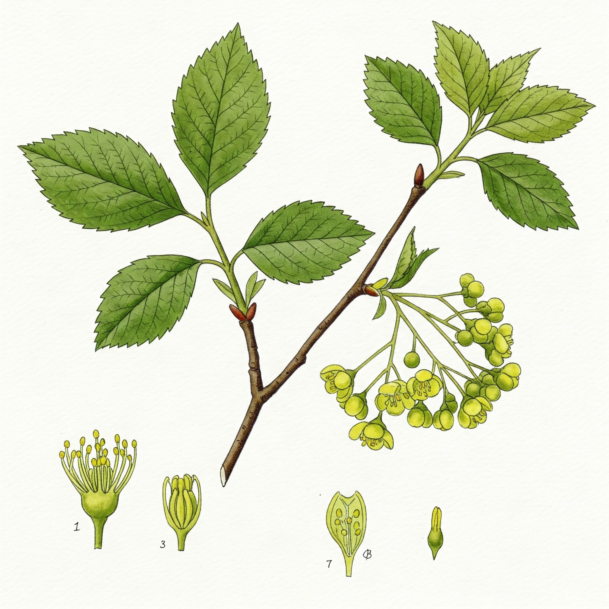 ALBERO DECIDUO DI MEDIE DIMENSIONI CON CHIOMA DENSA E RAMIFICAZIONE ERETTO-PATENTE. CORTECCIA GRIGIO-BRUNASTRA, FESSURATA LONGITUDINALMENTE. FOGLIE SEMPLICI, ALTERNE, OVATO-ELLITTICHE, CON BASE ASIMMETRICA, MARGINE DOPPIAMENTE SEGHETTATO E APICE ACUMINATO, GLABRE O LEGGERMENTE PUBESCENTI. FIORI ERMAFRODITI, PICCOLI, VERDASTRI, RIUNITI IN FASCETTI GLOBOSI E PENDULI CHE COMPAIONO PRIMA DELLE FOGLIE. FRUTTO È UNA SAMARA GLABRA, ELLITTICA O OBOVATA, CON SEME CENTRALE E ALA MEMBRANOSA, CHE MATURA IN PRIMAVERA.